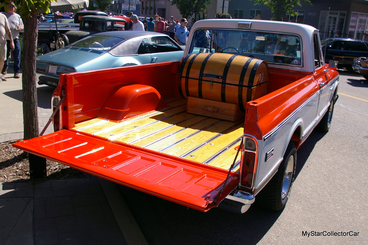 He didn’t want to tinker with his truck too much but decided to add a 700 R-4 automatic transmission with overdrive to drop the RPMs down on the highway. The result is a 55-year-old pickup that is comfortable between 70 and 80 mph (roughly 115-130K) on the highway, according to Jim. Nevertheless, Jim told MyStarCollectorCar his Chevy’s big block engine “likes its fuel”, in his words.