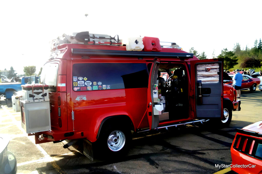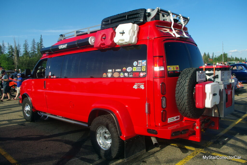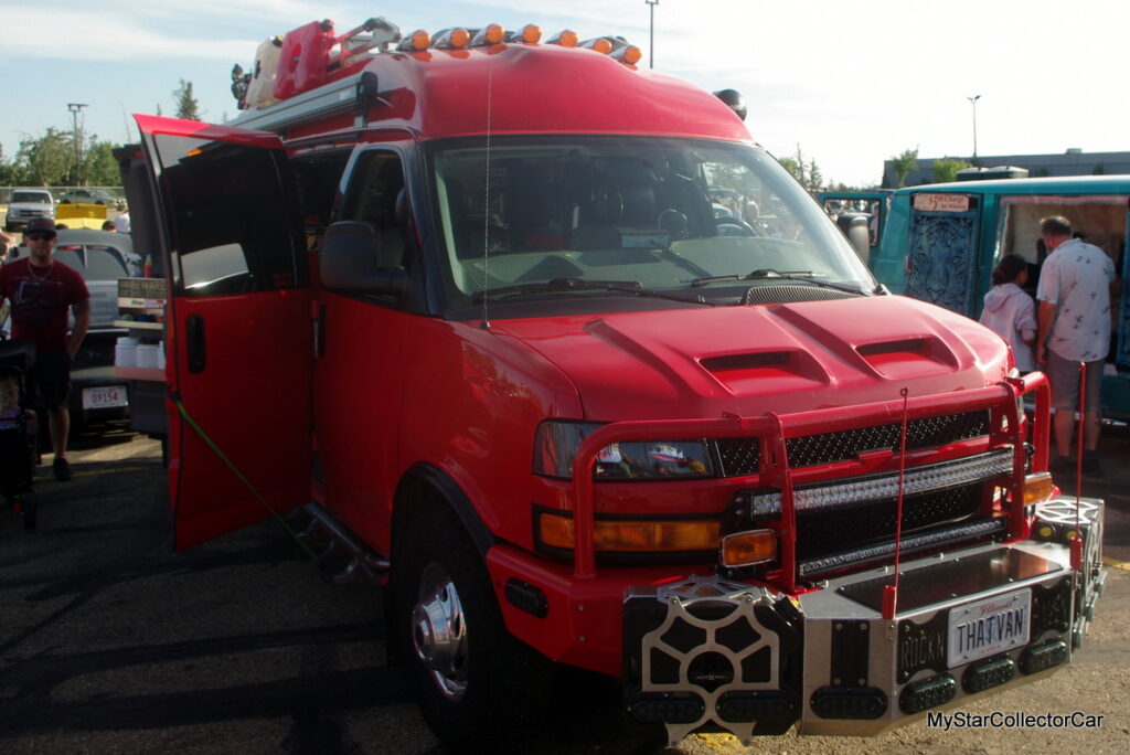 Kim Gault is the owner/builder of this Chevy he nicknamed ‘The Van’. He admitted he didn’t have a defined game plan when he built this RV/post Zombie monster vehicle. Kim said he just wanted a place to stay on one of his many road trips back and forth between Alberta, Canada and Michigan. Kim said he was, “tired of sleeping in his truck”.