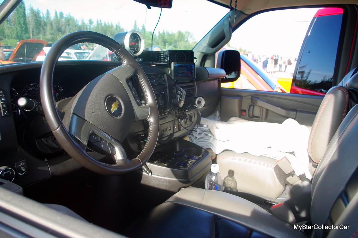 Kim loaded this van with stuff you’d never see on a factory 2017 Chevy van. There’s a bank of lights on the grille that would blind astronauts on the International Space Station. Kim gets asked about the red paint and said, “Most people think it’s a fire truck or some kind of emergency vehicle’.
