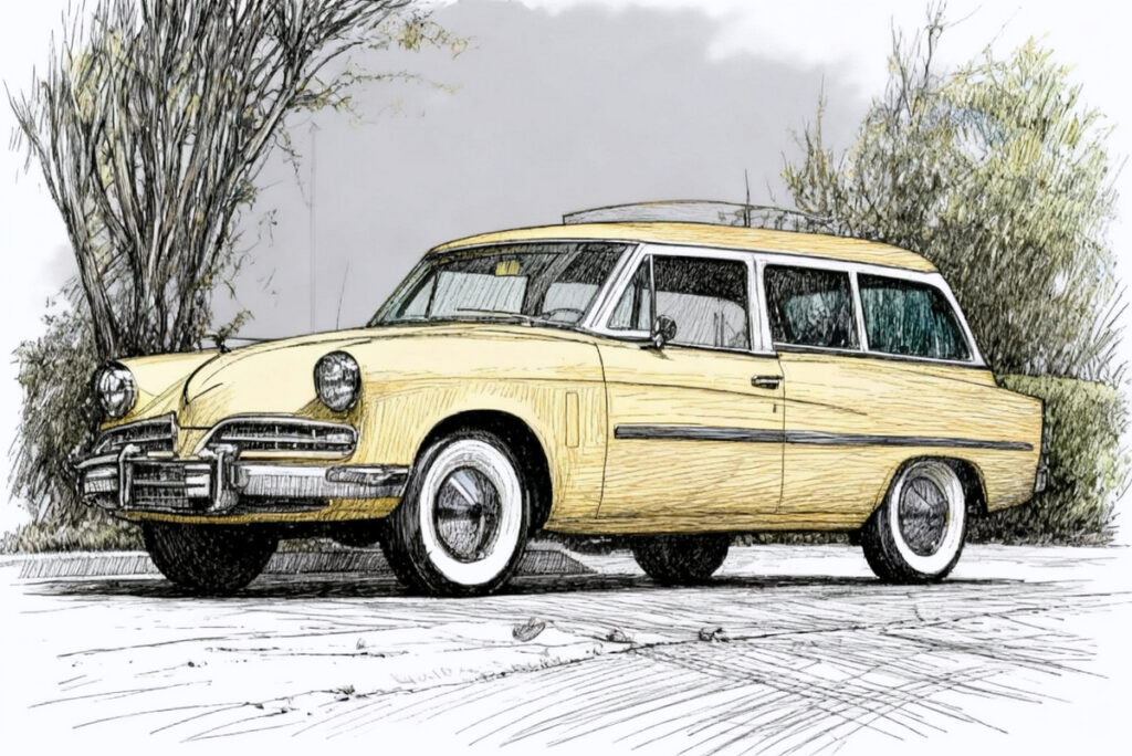The 1954 Studebaker Commander DeLuxe Conestaga wagon had its roots firmly in the early 1950s. The nose-cone hood telegraphed how Studebaker rolled with the punches and worked with what they had—not what they aspired to have.