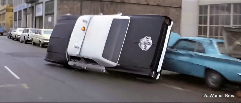 ‘Freebie and the Bean’ had a 1968 Ford Custom police car in one of the major chases. This Ford was a 6-year-old car at the time and one of the taillights was burnt out, so you knew this was a gently used cream-puff that used to be a family sedan. Or it was a thrashed ex-police car…either way it ended up on its lid after mangling a ’60 Corvair Monza.