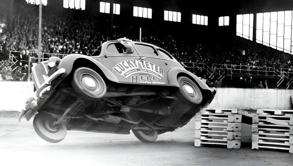 He came up short because the 1938 Plymouth’s engine started to cut out so he didn’t have the power to clear the ramp. Lucky plowed into the ramp and the whole platform fell on his car. This was going to be his last show because he was going to join the fight for freedom in World War II at 40 years old—that’s the kind of guy Lucky was.