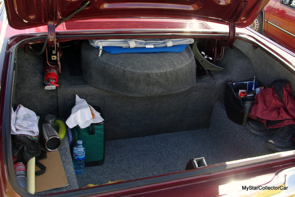 The original spare is still there–Colin explained how his father, “only used it a few times”. The spokes in the factory wheel covers are lost to time because they were brittle and hard to fix, but the rest of the wheel appointments are still there.