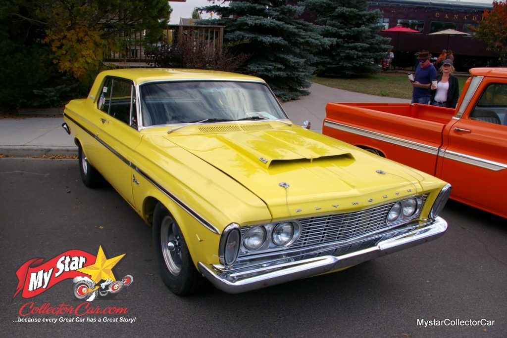 Jim’s ’63 Plymouth did indeed have a race history in eastern Canada, but it is not equipped with a 426 Wedge engine. Instead, the Plymouth has a 440 big block engine under its hood. The 440 cubic inch big block engine transplant in the Plymouth (complete with functional fresh air induction scoops) ensured this bright yellow beast would live up to the high-performance standards of the 426 Wedge on a track or street.