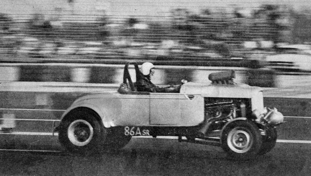 ‘Car Craft’ pointed out how this class had evolved to Austin and Fiat bodies, but this Model A body had been modified for speed to handle the blown Chrysler hemi.