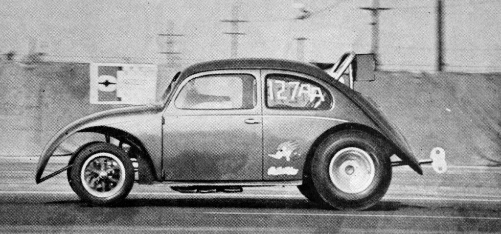 The Beetle body was completely sealed, so the driver entered through the roof of the little unibody rocket. Power came from a blown Chevy and the mags on it were just becoming popular at the track and on the street.