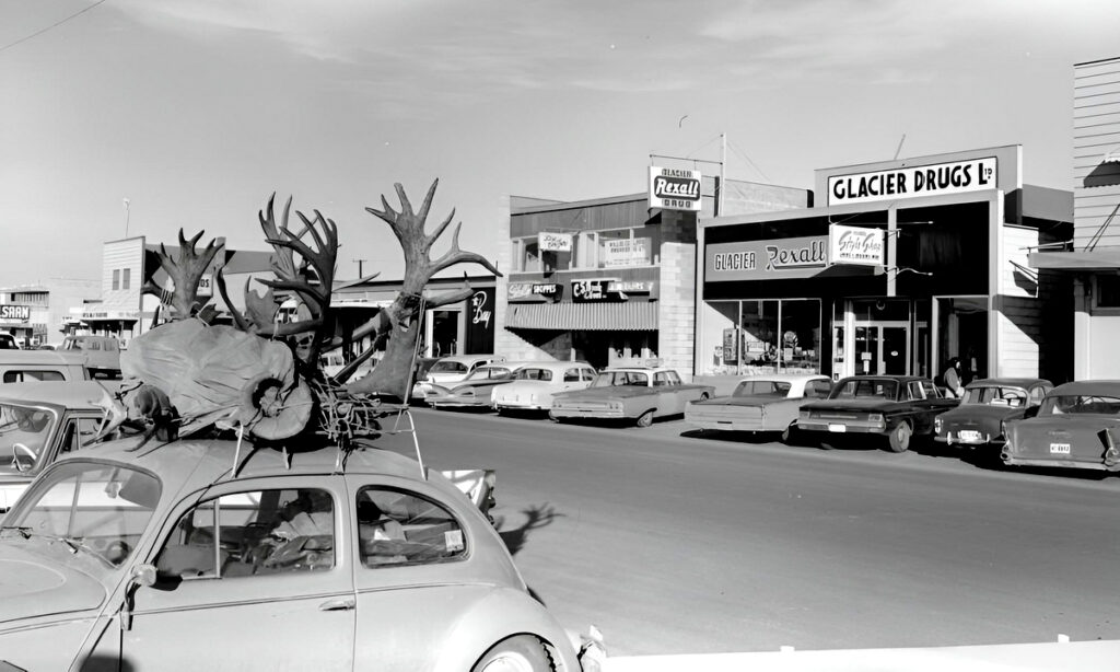 This is oil and cattle country, and it also has world class hunting venues. That explains the rack of antlers on the roof of the VW Beetle instead of the surfboard you’d see in California. The dusty, functional, barebones sedans explain why there weren’t any Lincolns or convertibles in Fort St. John back in 1963.