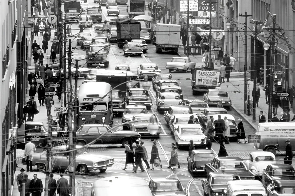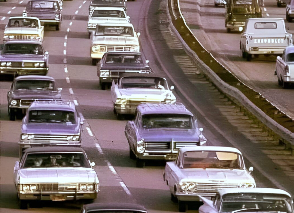 This is what you saw in ’68 LA—a traffic jam. The photo is pure California because there’s at least three lanes of cars not moving very fast. The cars are flashier because this is big-city USA—not small-town Canada.
