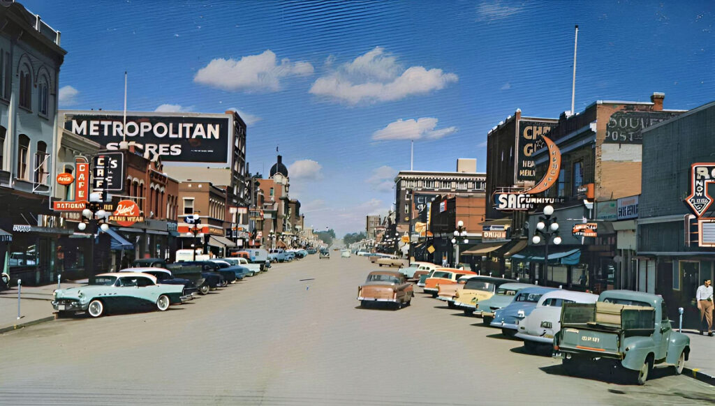 This is another photo from the 1950s, but it’s taken in Moose Jaw, Saskatchewan, Canada. Moose Jaw was a smaller prairie town in the late 1950s—and set in the middle of grain farming country. As you can see, the cars are primarily functional sedans, and the pickup truck came straight from the farm. The sky is blue and there are no traffic jams—it’s opposite world to LA.