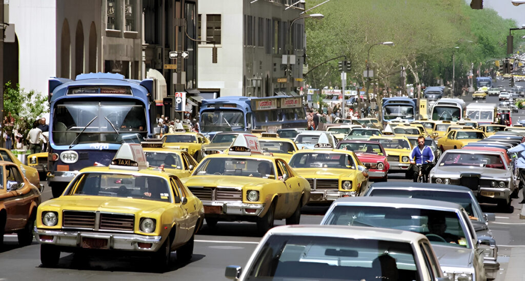 Half the traffic is comprised of B-body Mopar taxis because that’s how New Yorkers roll–then and now. The other cars are nothing special because driving wasn’t a way of life in New York, so those yellow cabs are far more important to them than a cool car.