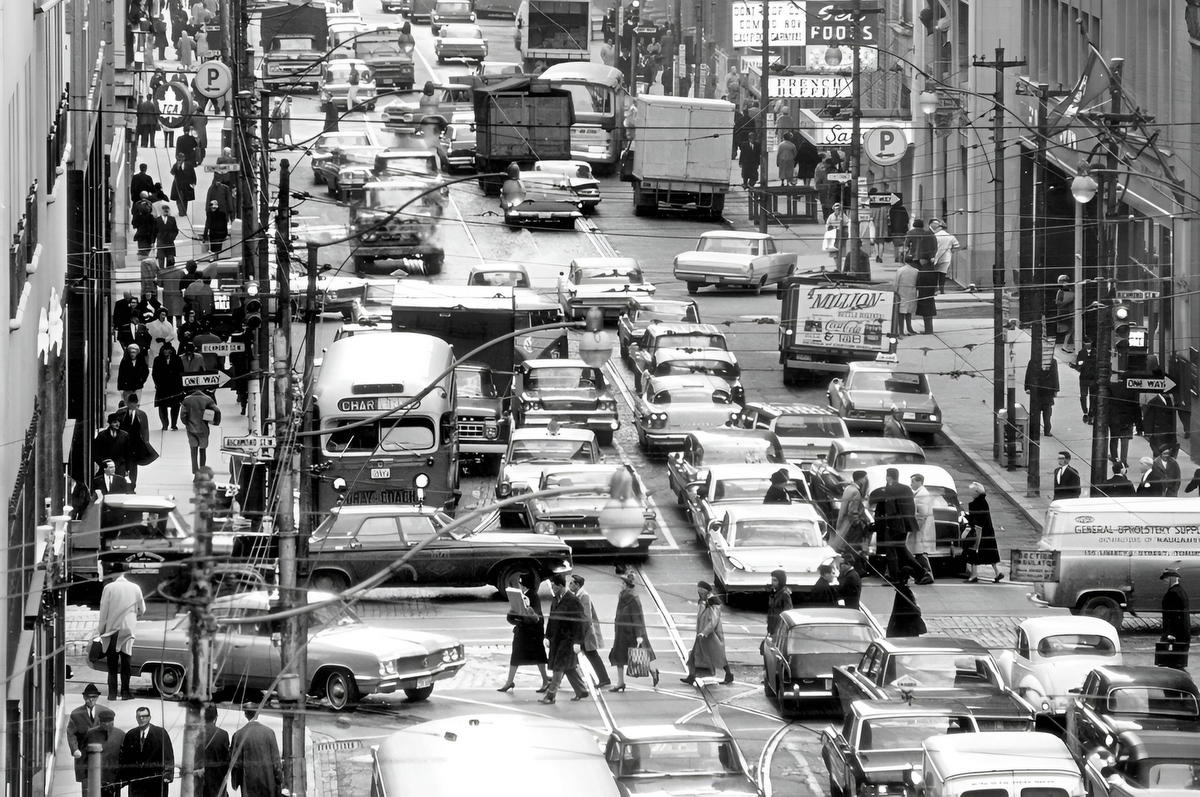 Car guys love old traffic photos because they are a time warp back to an era when cars had distinct personalities.