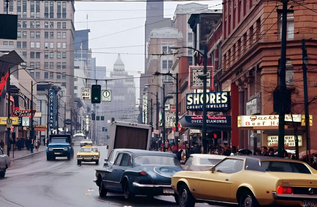 Vancouver is one of the biggest cities in Canada and it’s located on the west coast. This shot was taken in the rain—not unusual in Vancouver. Cars last longer there, so the first-gen Valiant makes sense. So does the Mustang because Vancouver was also a flashy city back then. The taxi also makes sense because the city is full of them thanks to tourist demand.