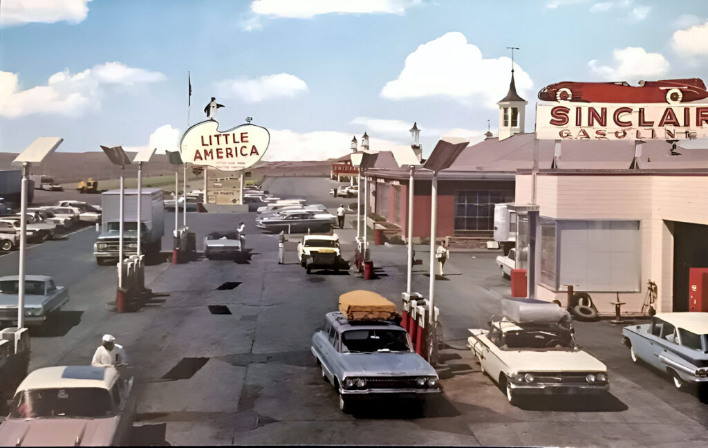 The gas station is full of station wagons and deluxe cars on vacation runs. Most of them are Chevys so this was either a ‘See the USA in your Chevrolet’ moment or a GM ad. Either way, it’s a far cry from life in 1960s Fort St. John, BC.